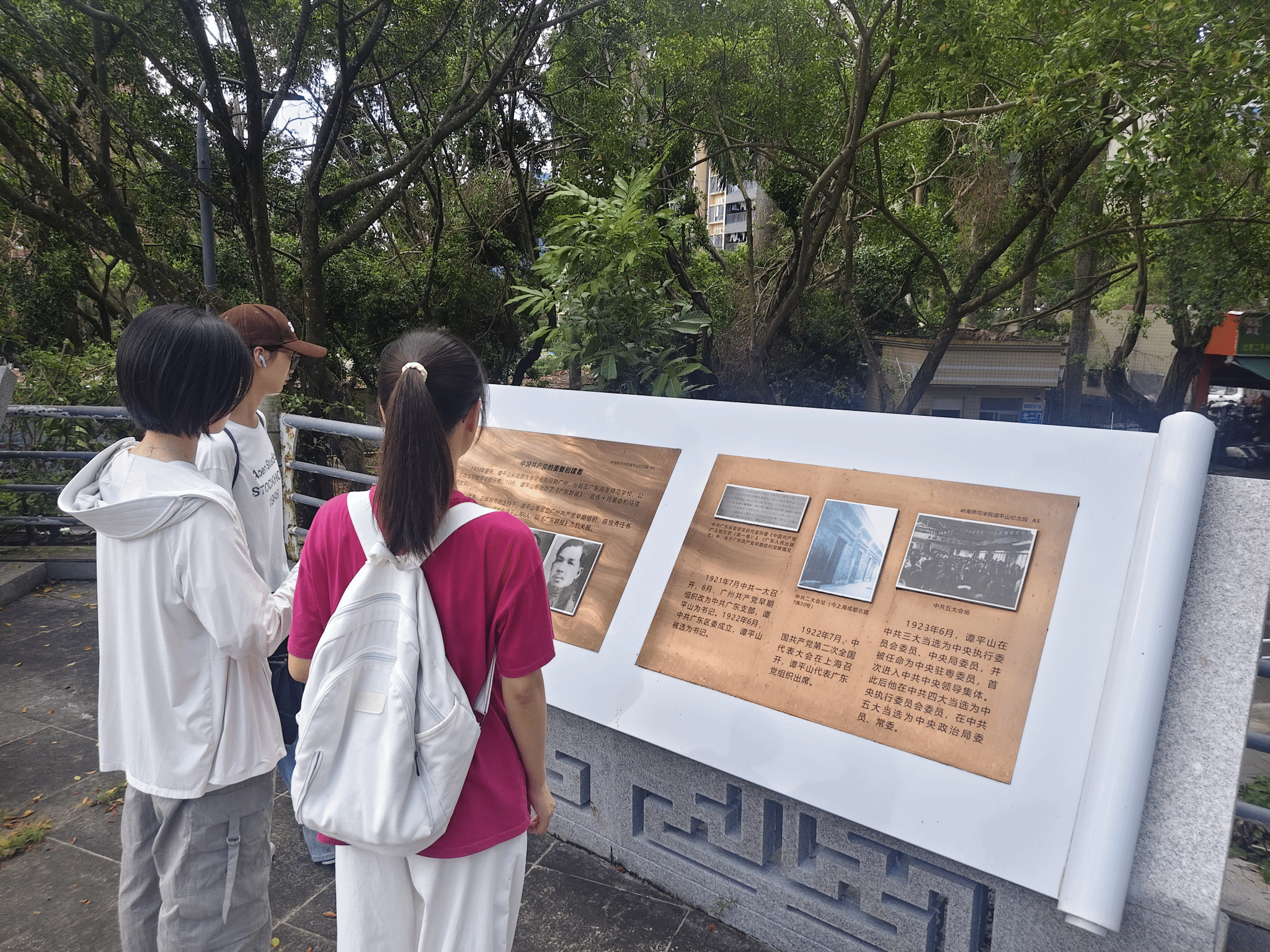 活动当天,同学们怀着肃穆崇敬的心情走进谭平山纪念园。在园内刻有谭平山同志生平事迹的石碑前,大家纷纷驻足停留,逐字逐句研读碑文内容。从碑文记载中,同学们系统了解到谭平山同志作为中国民主革命先驱、伟大爱国主义者的革命生涯——他参与创建中国共产党,在北伐战争中投身前线动员,在抗日战争时期积极呼吁团结御侮,在不同历史阶段始终以坚定的信仰、无畏的勇气践行革命理想。参观过程中,大家还结合所学党史知识,轻声交流对谭平山同志革命精神的理解,在相互探讨中深化对“坚守初心、无私奉献”内涵的认知。