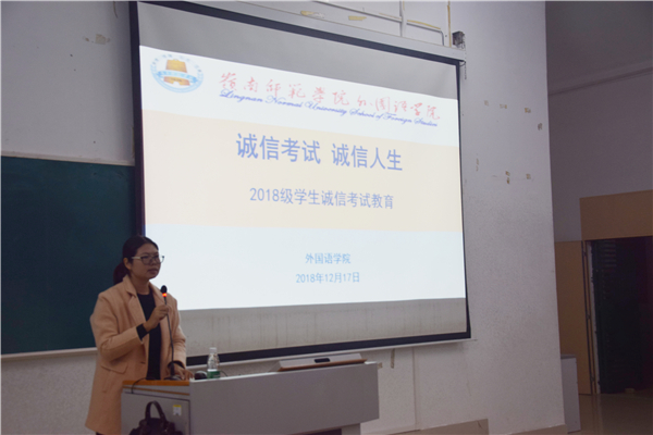 12月17日,外国语学院于弘雷楼511成功开展了“诚信考试、诚信人生2018级学生诚信考试教育”会议。本次会议由外国语学院2018级辅导员罗成燕主持,外国语学院2018级全体学生参与了本次会议。