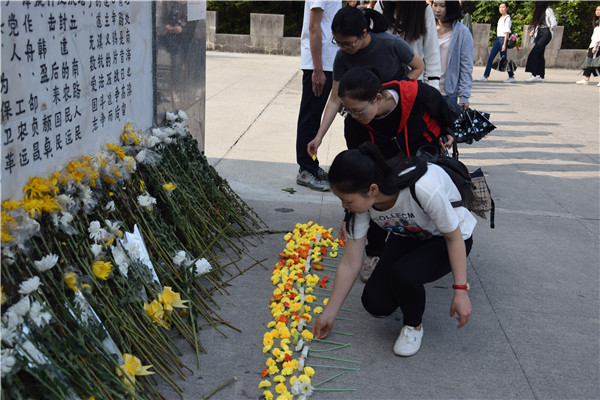 接下来,外国语学院团委秘书长带领在场的全体人员默哀一分钟,以表达对革命先烈最崇高的敬意,在场全体人员神情严肃,沉重地低头哀思。随后,秘书长宣布向烈士敬献花圈和小白花,各支部的同学们轻轻地捧着淡雅的小黄花,有秩序地上前,敬重地放在纪念碑前,缅怀先烈。活动结束后,现场的志愿者合影留念,并有秩序地离场。