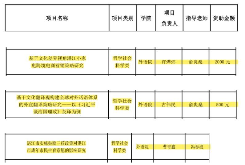 外国语学院学生积极申报岭南师范学院2022年度大学生第十四届科研项目申报,共有3项大学生科研项目获得立项资助,其中商务英语专业许烨炜负责的团队课题“基于文化差异视角湛江小家电跨境电商营销策略研究”获批重点项目;商务英语专业古伟民负责的课题“基于文化翻译观构建全球对外话语体系的外宣翻译策略研究——以《习近平谈治国理政》英译为例”获批一般项目;翻译专业曹青鑫负责的课题“湛江市实施鼓励三孩政策对湛江市成年市民生育意愿的影响研究”获批自筹项目。