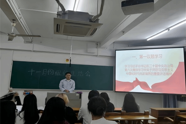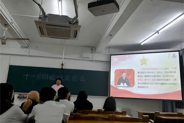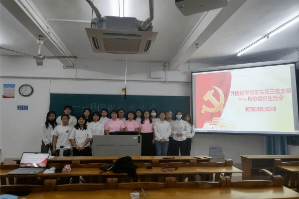 为深入学习宣传贯彻习近平新时代中国特色社会主义思想,厚植家国情怀,11月20日晚上,外国语学院学生第三党支部于教三208召开十一月份组织生活会。外国语学院学生第三党支部书记陈秋湛、“培根”宣讲团成员陈敏诗、黄雨和李佩君出席了此次会议,学生第三党支部党员与入党积极分子参加了此次会议。