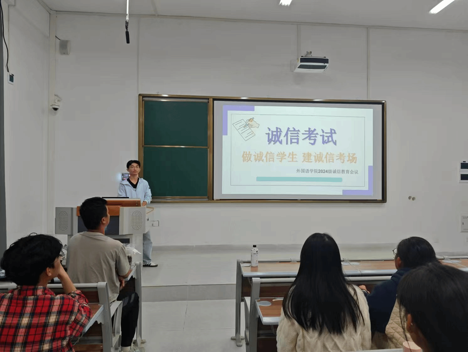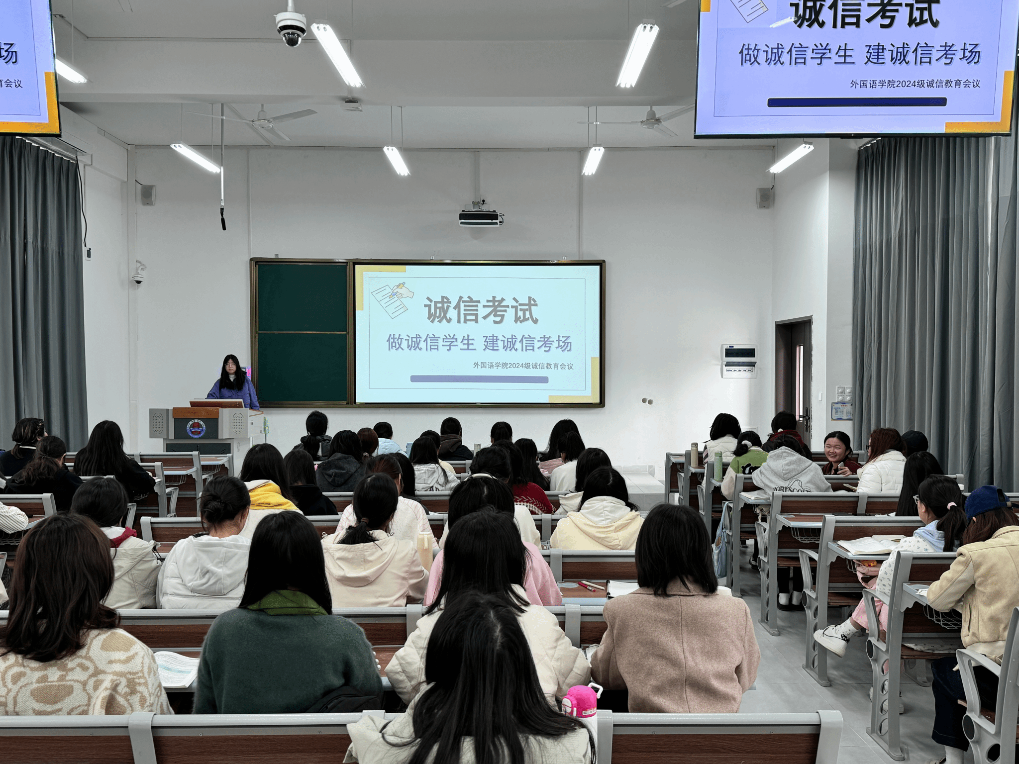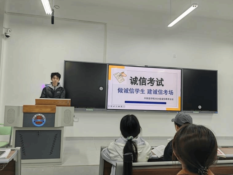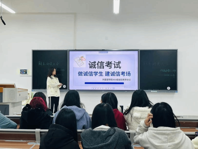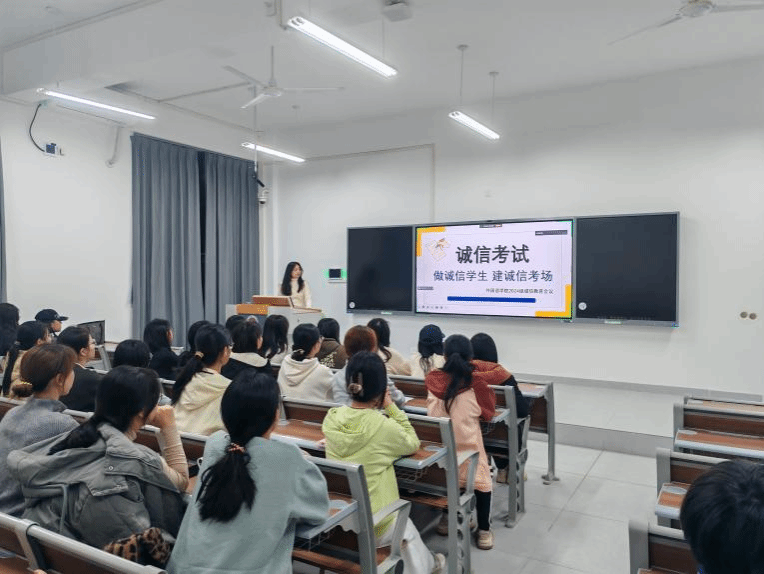 为弘扬校风、端正学风、规范考风,营造公平公正的考试环境。近日,外国语学院召开2024级诚信考试动员大会,各班级学生出席本次教育诚信会议。