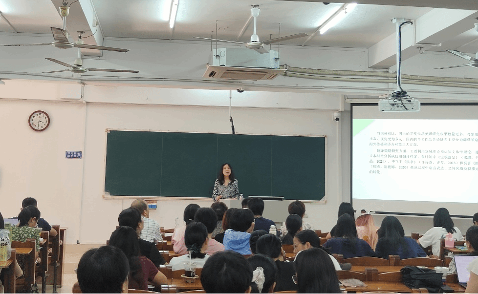 2024年9月20日下午,外国语学院在第三教学楼305室成功举办了“思齐”高端论坛・著名学者系列讲座第十九期,论坛荣幸邀请到了中山大学教授、博士生导师邵璐教授莅临,并做了主题为“茅盾文学奖获奖作品英译与国际传播“的学术讲座。本次讲座旨在深入探讨中国当代文学翻译与传播的现状与挑战。外国语学院的全体教职工及部分翻译专业的学生参与了学习,会议由周扬副院长主持。
