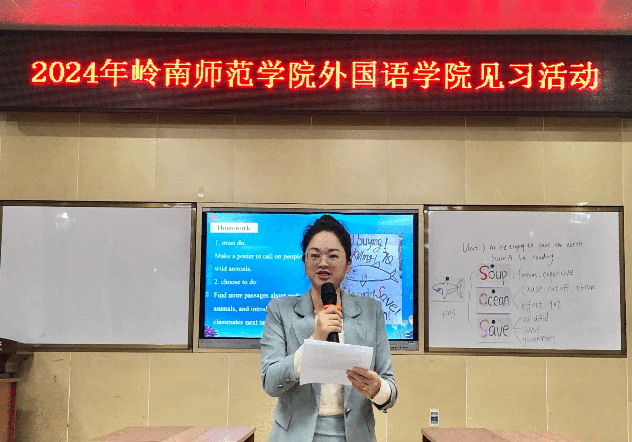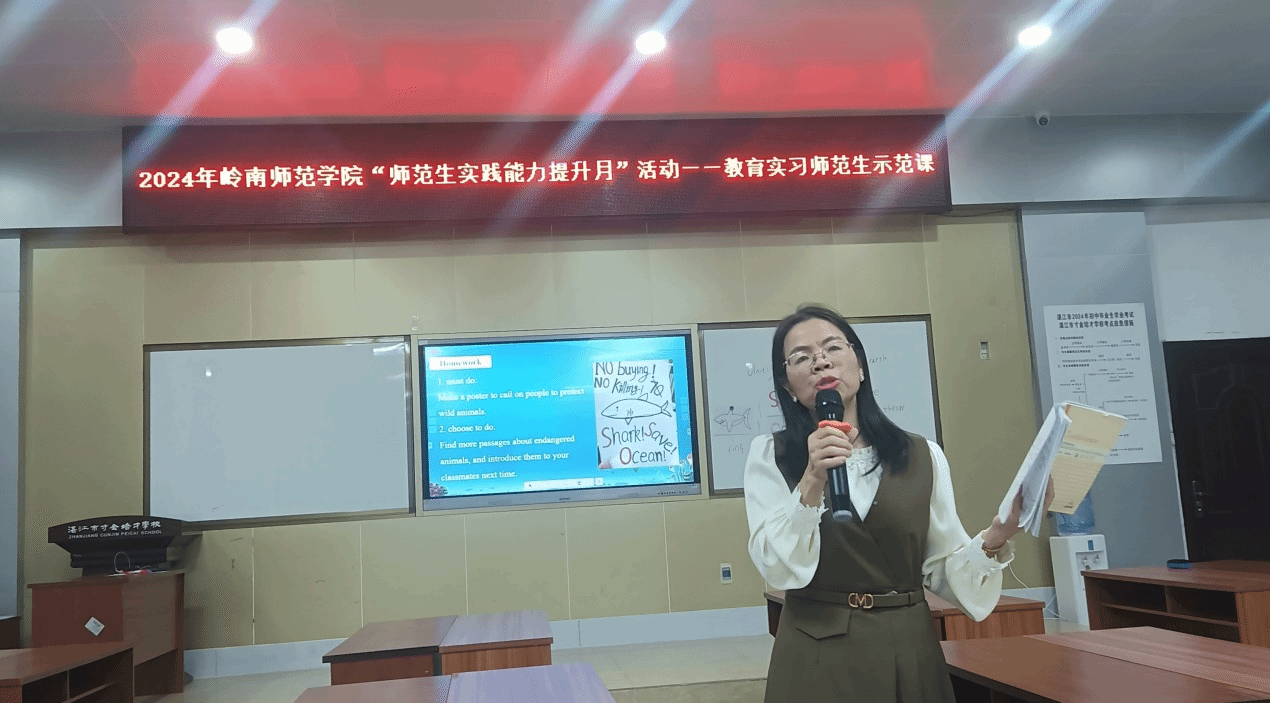接下来,实习生王颖莹上了示范课,她在教学过程中采用了多种教学方法,如动画导入、头脑风暴、快速浏览(skimming)、细节扫读(scanning)等,这些教学方法不仅激发了学生的学习兴趣,还帮助学生更好地理解和掌握了文章内容。校内外指导教师及赤坎区教研员劳业丽对实习生的示范课做了点评。