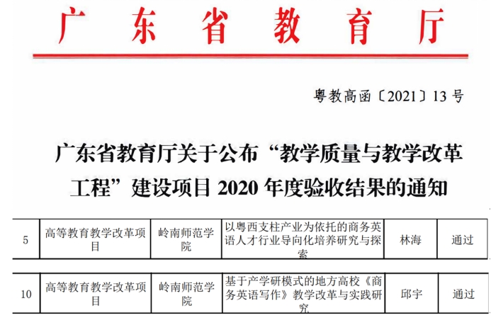 近日,根据《广东省教育厅关于公布“教育质量与教学改革工程”建设项目2020年度验收结果的通知》(粤教高函【2021】13号),经校内结题、省级初审、专家评审、公示、复审等环节,商务英语专业2个项目顺利通过结题验收,也是我院唯有的2个项目。通过验收的项目分别是:商务英语专业林海老师负责的“以粤西支柱产业为依托的商务英语人才行业导向化培养研究与探索”和商务英语专业邱宇老师负责的“基于产学研模式的地方高校《商务英语写作》教学改革与实践研究”。