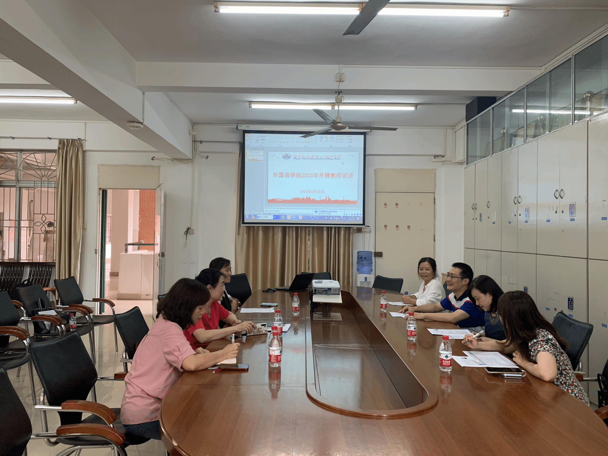 6月20日下午,外国语学院英语专业组织了“英语课程与教学论”与“中学英语课程标准与教材分析”两门课程的外聘教师面试与试讲活动。本次活动由英语系主任古永辉老师主持,外国语学院曹耀萍副院长、英语专业负责人刘玉梅教授、英语专业课程与教学论专家刘晓玲副教授担任面试官。参加面试和试讲的有湛江市教育局教研室蔡艳莲副主任、湛江市第二中学海东中学教研处副主任高筱婉老师、湛江一中培才学校邓翠娟老师。