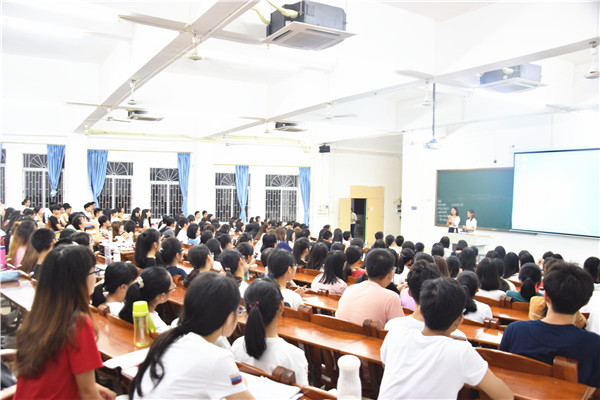 本次会议分为五个环节。第一环节是由系主任杨红教授进行发言。她首先代表日语系全体师生向日语系2018级同学的到来表示忠心的祝贺和热烈的欢迎,并向大家介绍了日语系的各位老师们。紧接着她强调了三点内容。第一,日语系拥有“家文化”的传统。对于每一位学生、每一位师弟师妹,老师和前辈们都不仅会给予他们温暖的帮助,同时还会帮助他们纠正错误,带领他们成长。第二,要牢记“做个好人,学好日语”的系训。杨红教授希望大家在学好日语的之前,首先要学会做个好人。第三,岭师日语系的办学特色突出。岭师日语系不仅在2017年的全国学友会当中的日语专业学校排名第64位,而且拥有非常雄厚的师资力量。除外,日语系的教学科研、人才培养等也在不断地发展。最后杨红教授祝愿各位新生都能开启不同于高中时代的、精彩丰富且无怨无悔的大学生活。