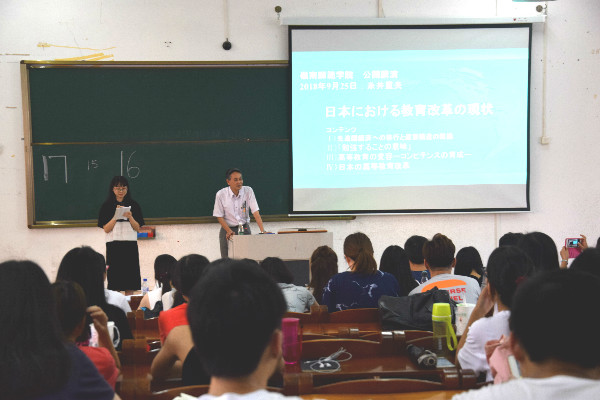9月25日下午,外国语学院于教三611教室成功召开题为“试析日本教育现状”的讲座。日本中央大学经济学博士、松本大学松商学园短期大学院长丝井重夫教授为此次讲座主讲人,外语院副院长兼日语系主任杨红教授担任主持人。日语系2015、2016、2017级同学及部分教师参加了本次讲座。