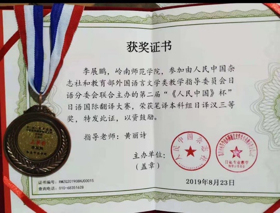 “人民中国杯”日语国际翻译大赛始于2018年,由中国外文局人民中国杂志社和教育部日语教指委联合主办,广东省翻译协会和广州市联普翻译有限公司联合承办。本次大赛共有来自中国和日本600多所高校、企业的近3000名选手参加。大赛设置笔译和口译两个项目,各项目又分设高职专科组、本科组、研究生组以及社会组,各项目及组别分别计算成绩、设立奖项。经过多轮专业评审团队的严格评选,在笔译项目本科组的日译汉评选出3个一等奖、17个二等奖、33个三等奖。李展鹏同学技压群雄,脱颖而出,一举夺得日译汉的三等奖,凸显了我院日语系学子扎实的专业功力。