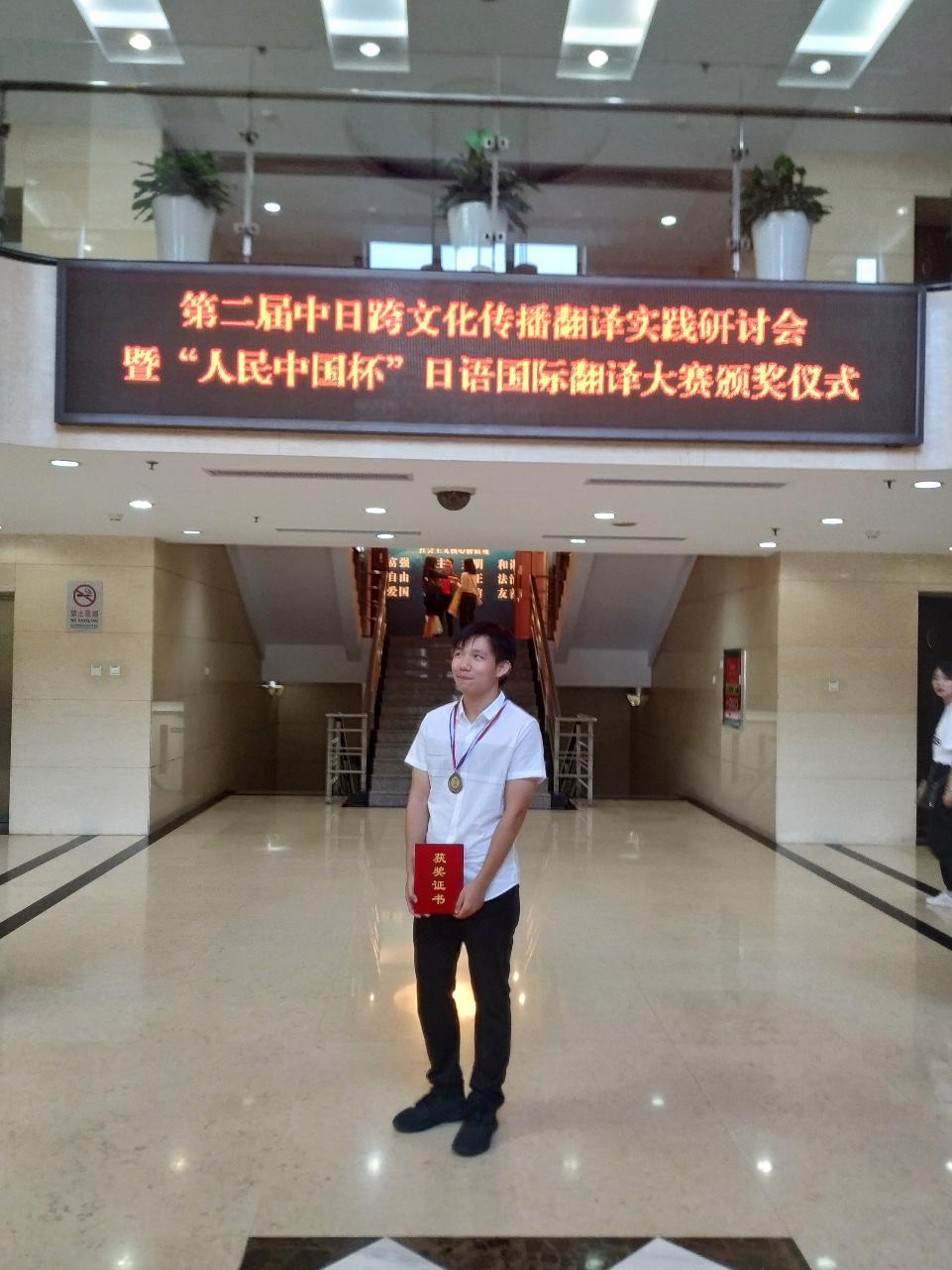 8月25日下午,“人民中国杯”日语国际翻译大赛颁奖仪式在中国外文局礼堂举行。我院日语系2017级学子李展鹏荣获本科组日译汉三等奖。