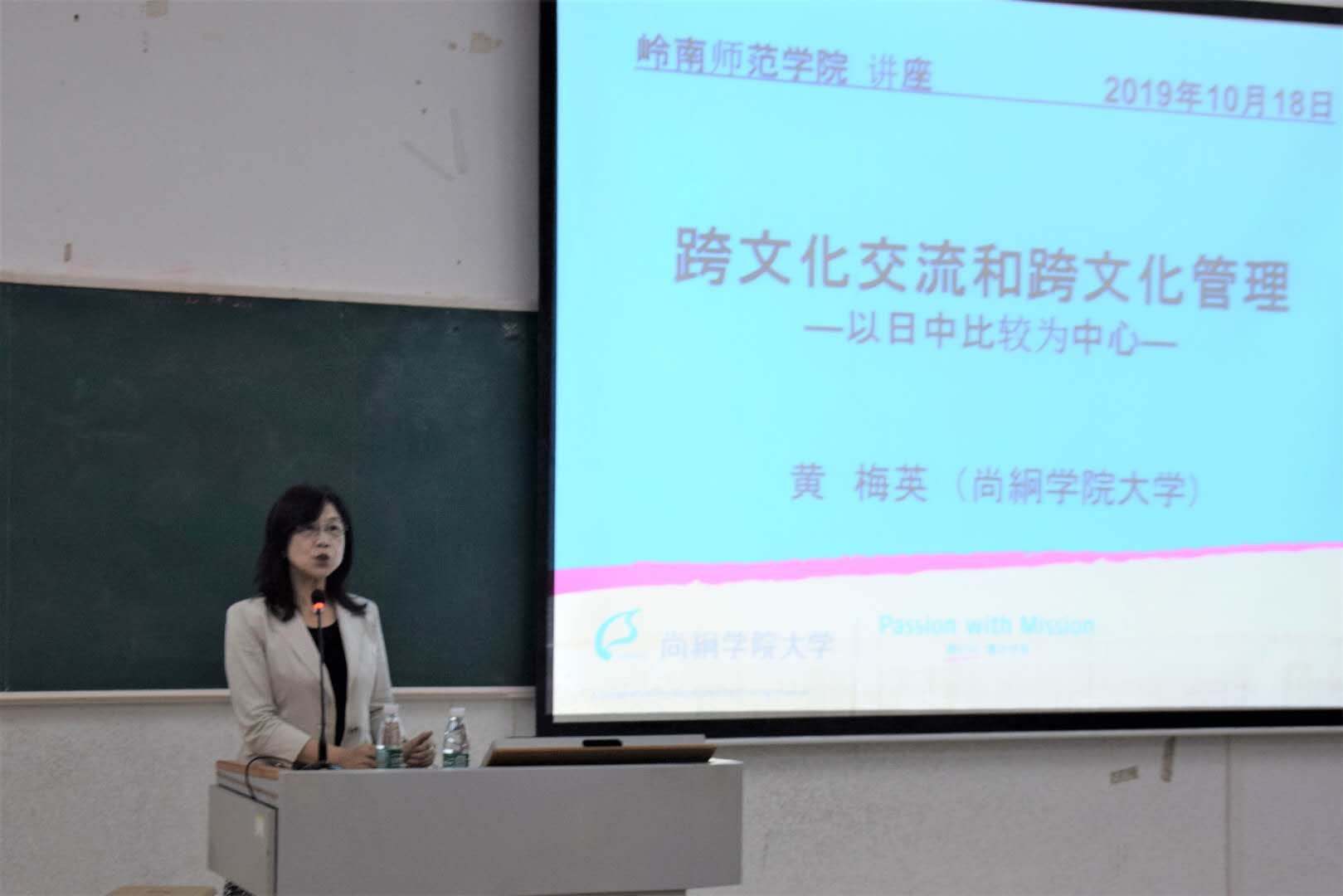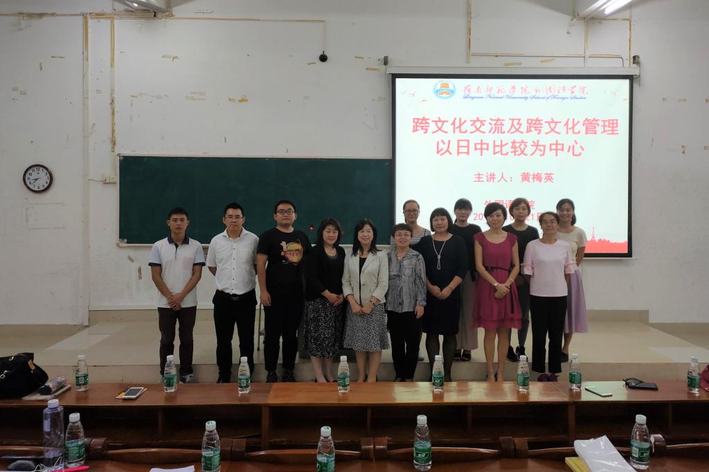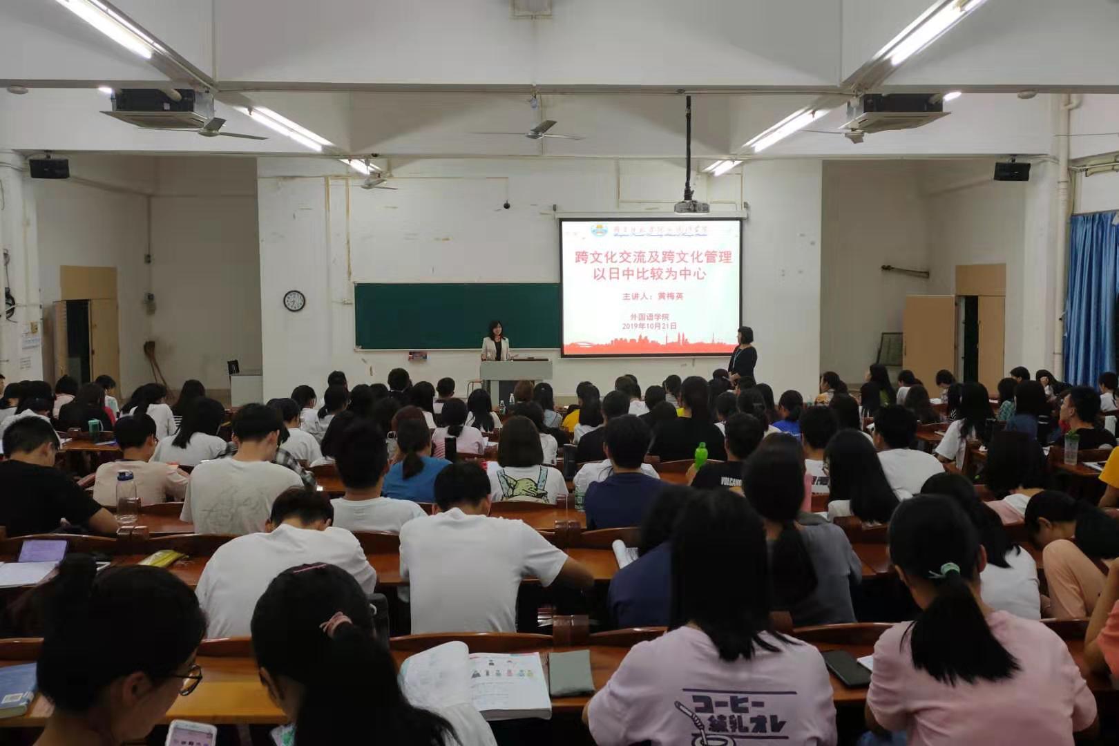 10月21日晚上,外国语学院在第三教学楼511室成功举办跨文化交流及跨文化管理——以日中比较为中心的讲座。本次讲座由外国语学院副院长兼任日语系主任的杨红老师主持,日本尚綗大学教务部黄梅英教授主讲,日本会泽麻理惠教授、英语系屈书杰教授、日语系部分教师以及日语系全体学生参加了本次讲座。