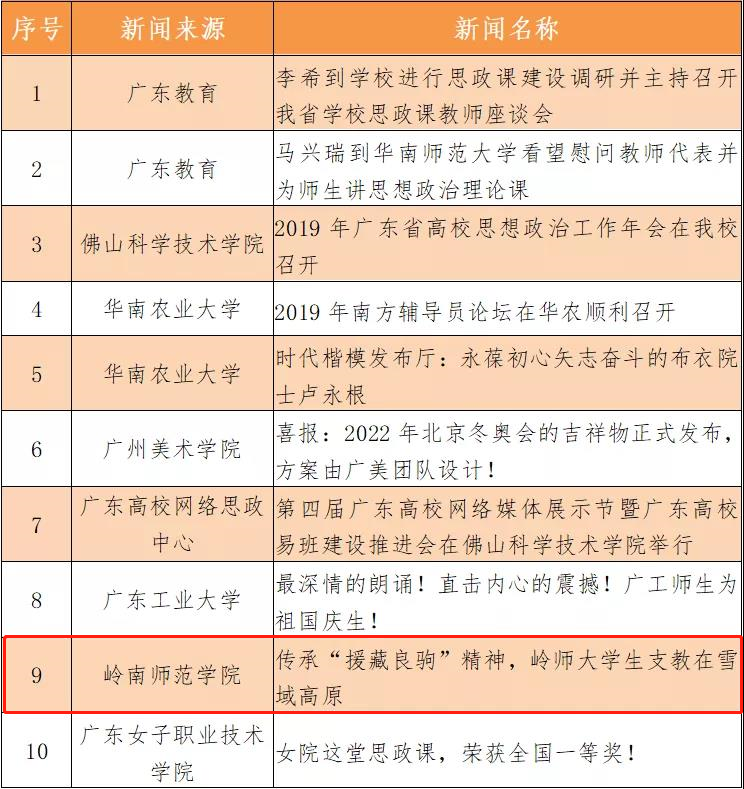 4月23日,广东高校网络思想政治工作中心公布2019年广东高校十大网络思政新闻评选活动结果,岭南师范学院新闻《传承“援藏良驹”精神,岭师大学生支教在雪域高原》入选“2019年度广东高校十大网络思政新闻”。
