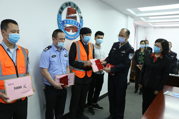 苏古发同志代表学校感谢公安机关一直以来对学校安全稳定工作的大力支持和帮助,感谢对钟三军等同志的关心和爱护;祝贺5位队员分别获得省和市见义勇为先进个人荣誉,称赞他们敢于与犯罪分子英勇斗争,也彰显了我们的安保队伍是训练有素、教育有方的队伍,展示了岭师安保队伍良好形象。希望获奖的校卫队员戒骄戒躁,继续发扬不畏邪恶,弘扬正气精神,保护师生生命安全和财产安全。也希望公安机关一如既往支持指导学校安全稳定工作。