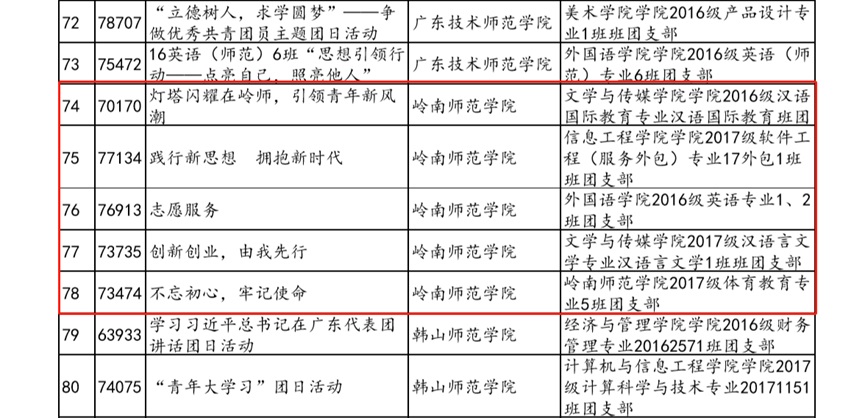 我校自开展团日活动以来,以习近平新时代中国特色社会主义思想为指导,推出“导学式”主题团日活动,不断加强大学生思想引领。我校2016级汉语国际教育班团支部等五个团支部紧扣十九大精神的活动主题,活动形式多样,内容丰富充实,无一不展现出我校青年学子在团组织活动中积极向上、青春洋溢的风貌,同时也希望我校各团支部以五个团支部为榜样,学习经验,锐意创新。此项荣誉是我校共青团改革的一项重大成果,是上级对我校共青团工作的充分肯定。校团委将以此为契机,进一步贯彻落实《岭南师范学院共青团改革实施方案》,争取2018年第二赛季取得更好的成绩,实现更大的突破!