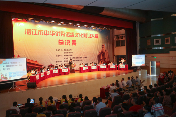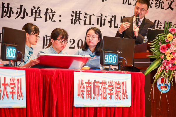 湛江市中华优秀传统文化知识大赛围绕“弘扬传统文化·培育时代新人”为主题,大力弘扬中华传统美德、人文精神,推动中华优秀传统文化融入国民教育各环节,培育时代新人。本次比赛分为必答题、抢答题、拓展题三个环节,参赛队伍以小学、初中、高中和大学四个小组分别进行角逐。决赛中,我校队员沉着冷静,全力以赴,准确无误答对必答环节所有题目。在激烈的抢答环节中,队员们面对其他选手的成功抢答毫不乱阵脚,从容不迫,配合默契,并以优异的表现完成拓展题的讲述,赛出了岭师学子的精神风貌,展现出深厚的中华传统文化知识底蕴,最后遥遥领先大学组其他三支队伍,取得了总分高达752.44的佳绩,赢得了全场观众的欢呼与掌声。