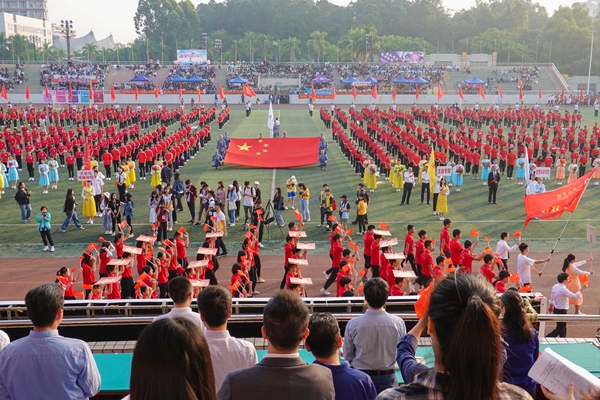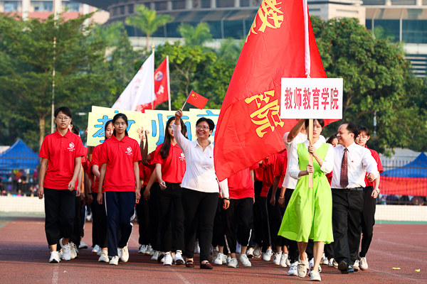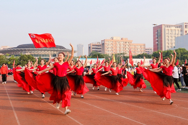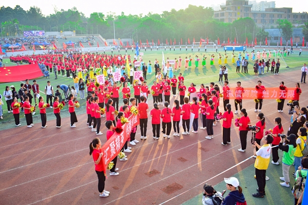 伴随着雄壮的《运动员进行曲》,国旗队、校旗队、红旗队、鲜花队、裁判员队伍、各学院代表团方队依次进场。现场呐喊助威声不绝于耳,整齐的口号响彻云霄,特色创意表演层出不穷,赢得了在场师生的欢呼声和阵阵掌声,运动场上洋溢一片朝气蓬勃的景象。