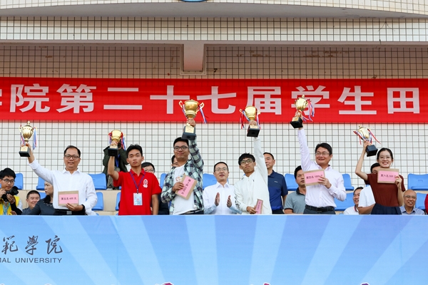 总裁判长廖辉宣读运动会比赛成绩,组委会办公室主任肖洁宣读获奖名单。其中法政学院等10支代表队获得“体育道德风尚奖”,刘嘉鑫等48名运动员获得“优秀运动员”称号,李文等51位裁判员获得“优秀裁判员”称号,2018级体育教育以271.5分获得专业组团体第一名,数计学院以320分获得普通组团体第一名。