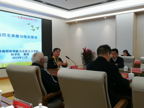 何宇红教授受邀做题为《爱人民-孔繁森精神的历史承继与现实要求》的发言。何宇红表示:爱人民是孔繁森精神的核心和主线,学习孔繁森精神需要从中华优秀传统文化、中国共产党的初心和使命、国家公务员的职业道德要求等多个角度探求其历史承继,以找到其精神本质和核心要旨;弘扬孔繁森精神需要研究爱的艺术,做到爱要有心、有行,更要有技、有法。何宇红还详细介绍了岭南师院开展“弘扬繁森精神,增强使命担当”主题活动的情况,得到了与会者的认同和赞赏。