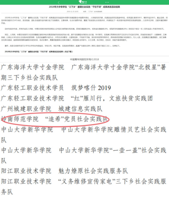 近日,从中国青年网获奖名单公示中获知,我校“追希”社会实践队从1万4千多个项目中脱颖而出,勇夺2019年全国大中专学生“三下乡”暑假社会实践“千校千项”优秀团队的佳绩,这也是我校今年唯一一支荣获此项奖项的实践队伍。
