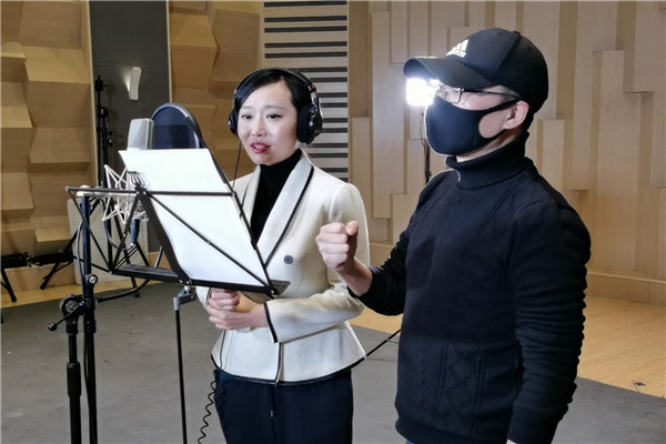 张威(右)在指导歌曲录制