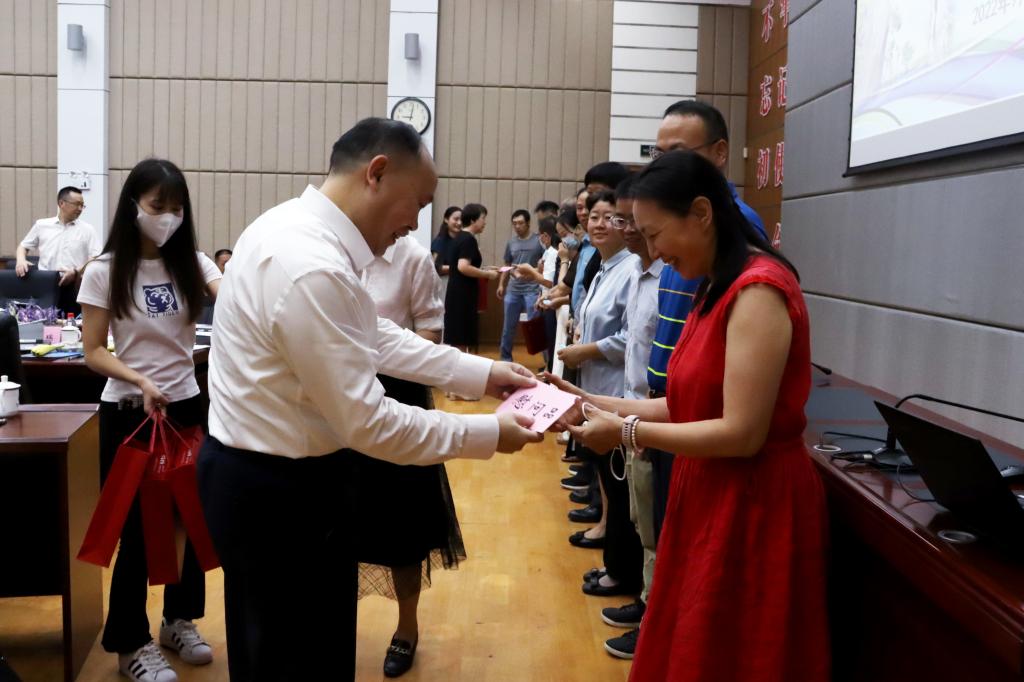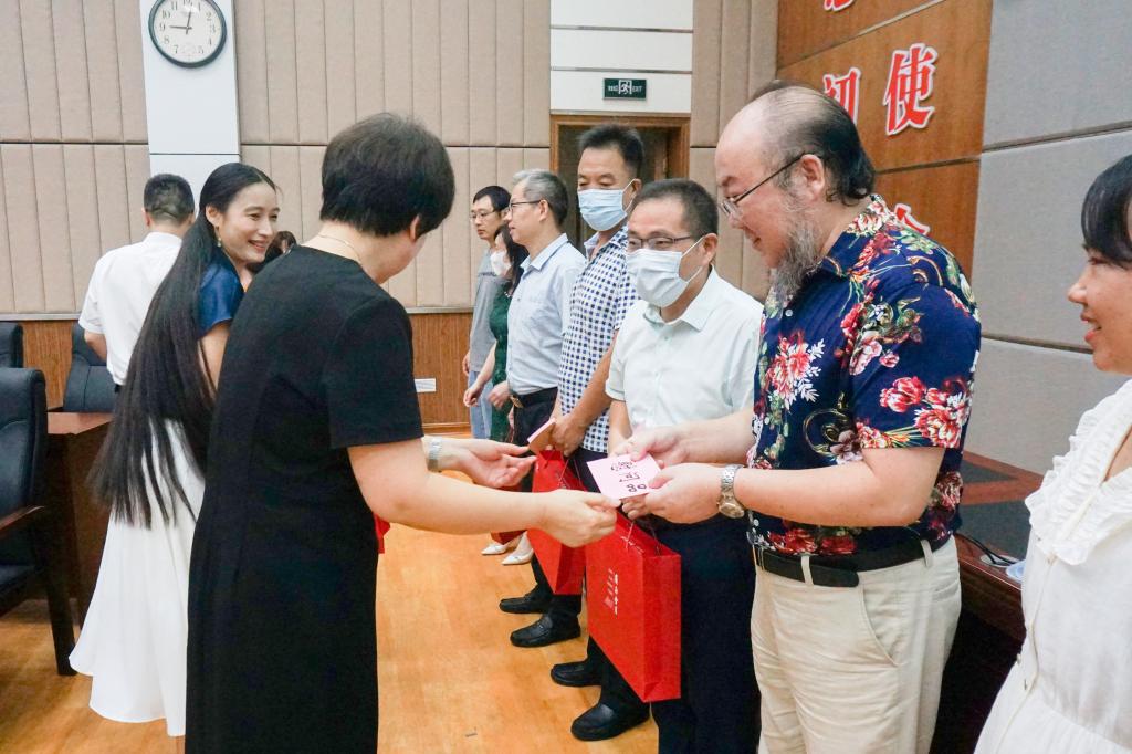 学校党委书记兰艳泽为参加座谈会教师送上节日慰问礼品(杨粤晴摄)