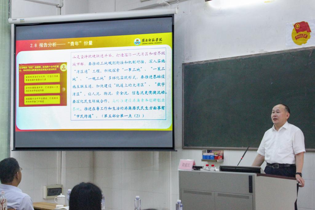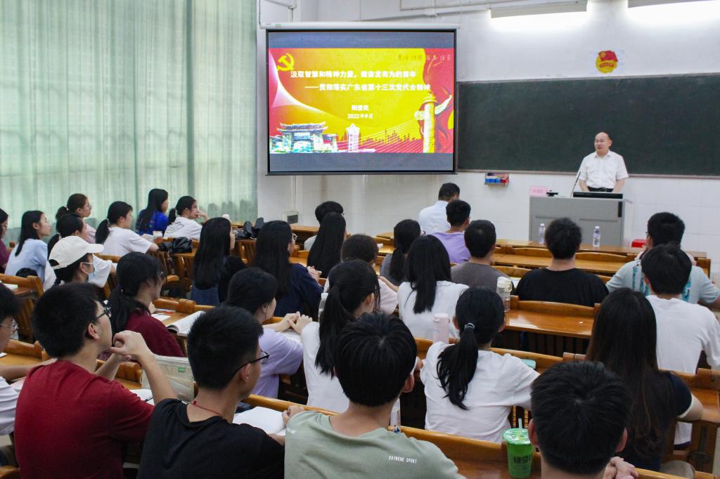 阳爱民从广东省第十三次党代会概述、党代会报告的主要内容,以及汲取智慧和精神力量做奋发有为的青年三个方面向同学们详细讲述了广东省第十三次党代会精神。指出省第十三次党代会是坚持以习近平新时代中国特色社会主义思想为指导,忠诚拥护“两个确立”、坚决做到“两个维护”,紧跟总书记、奋进新征程的大会,是一次统一思想、凝心聚力、求真务实、风清气正的大会,对广东当前和今后一个时期的发展具有重要意义。