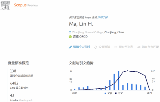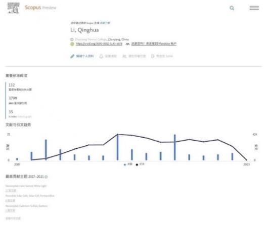 Scopus数据库统计论文发表情况 (a)马琳教授;(b)李清华教授