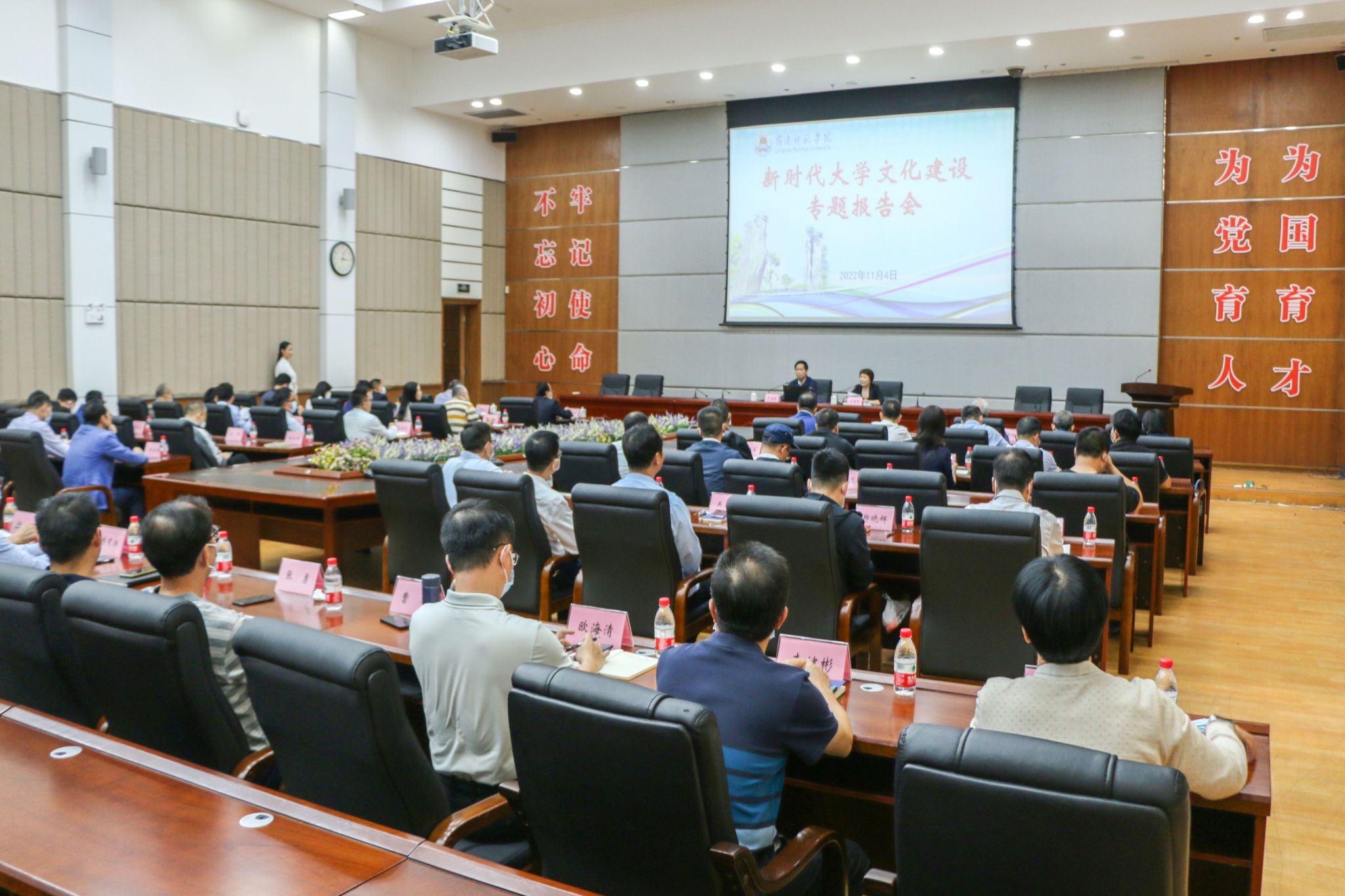 岭师新闻中心讯:11月4日,学校召开新时代大学文化建设专题报告会。省政协委员,广东开放大学原党委书记,岭南师范学院原党委书记、院长罗海鸥教授应邀莅校作题为《新时代大学文化建设的思考和实践》的专题报告。学校党委书记兰艳泽主持会议,副校长苏古发出席会议。