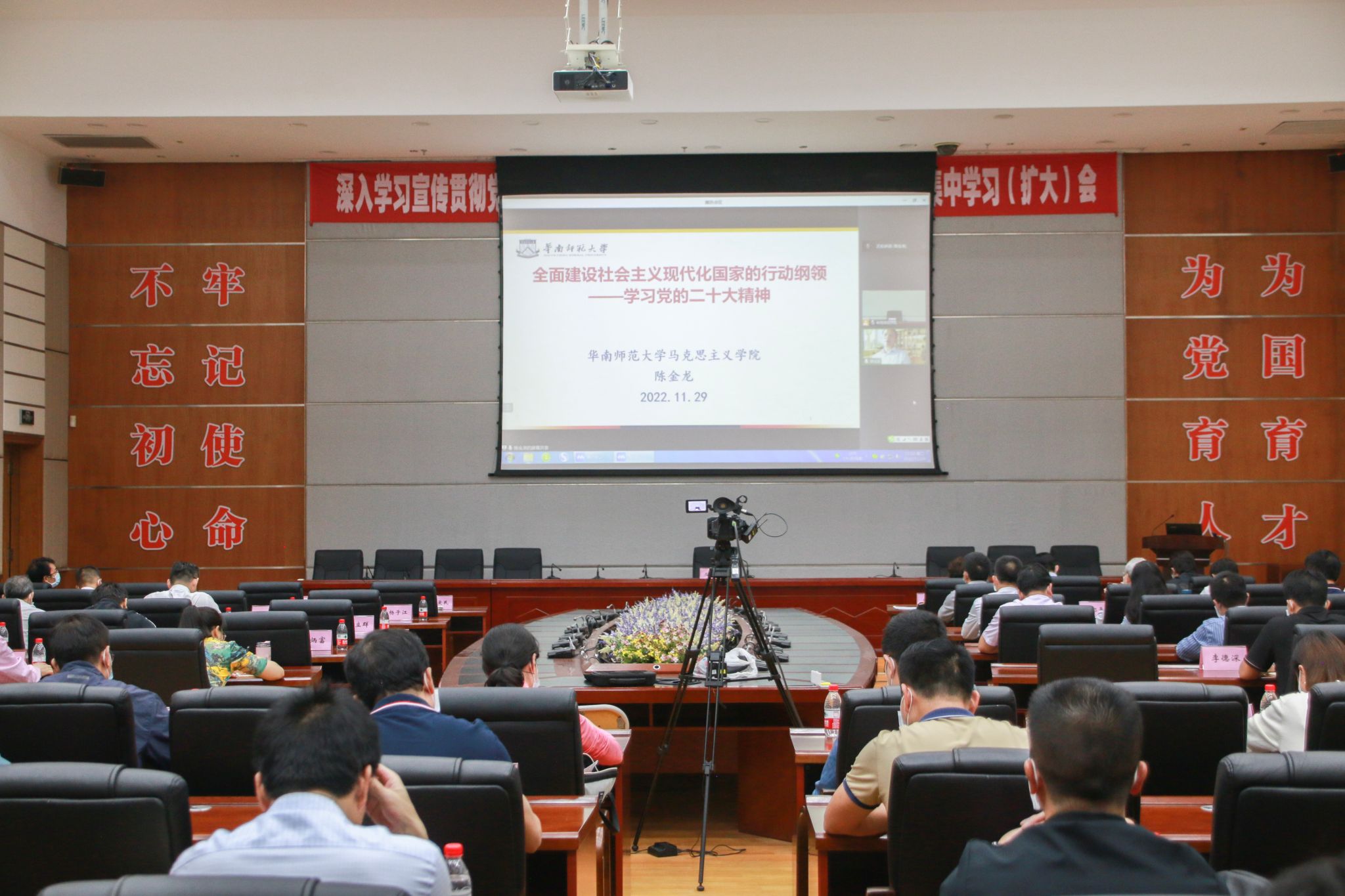 下午,陈金龙教授以“全面建设社会主义现代化国家的行动纲领——学习党的二十大精神”为题,从“深刻认识党的二十大的主题、主要成果,深刻认识过去五年和新时代十年的伟大变革,深刻认识习近平新时代中国特色社会主义思想开辟马克思主义中国化时代化新境界,深刻认识中国式现代化的新论断,深刻认识全面建设社会主义现代化国家的目标任务,深刻认识坚持党的全面领导和全面从严治党,深刻认识前进道路上的风险挑战”等七个方面对党的二十大精神进行了全面系统、深入浅出地解读,为大家上了一堂深刻的马克思主义思想政治课。