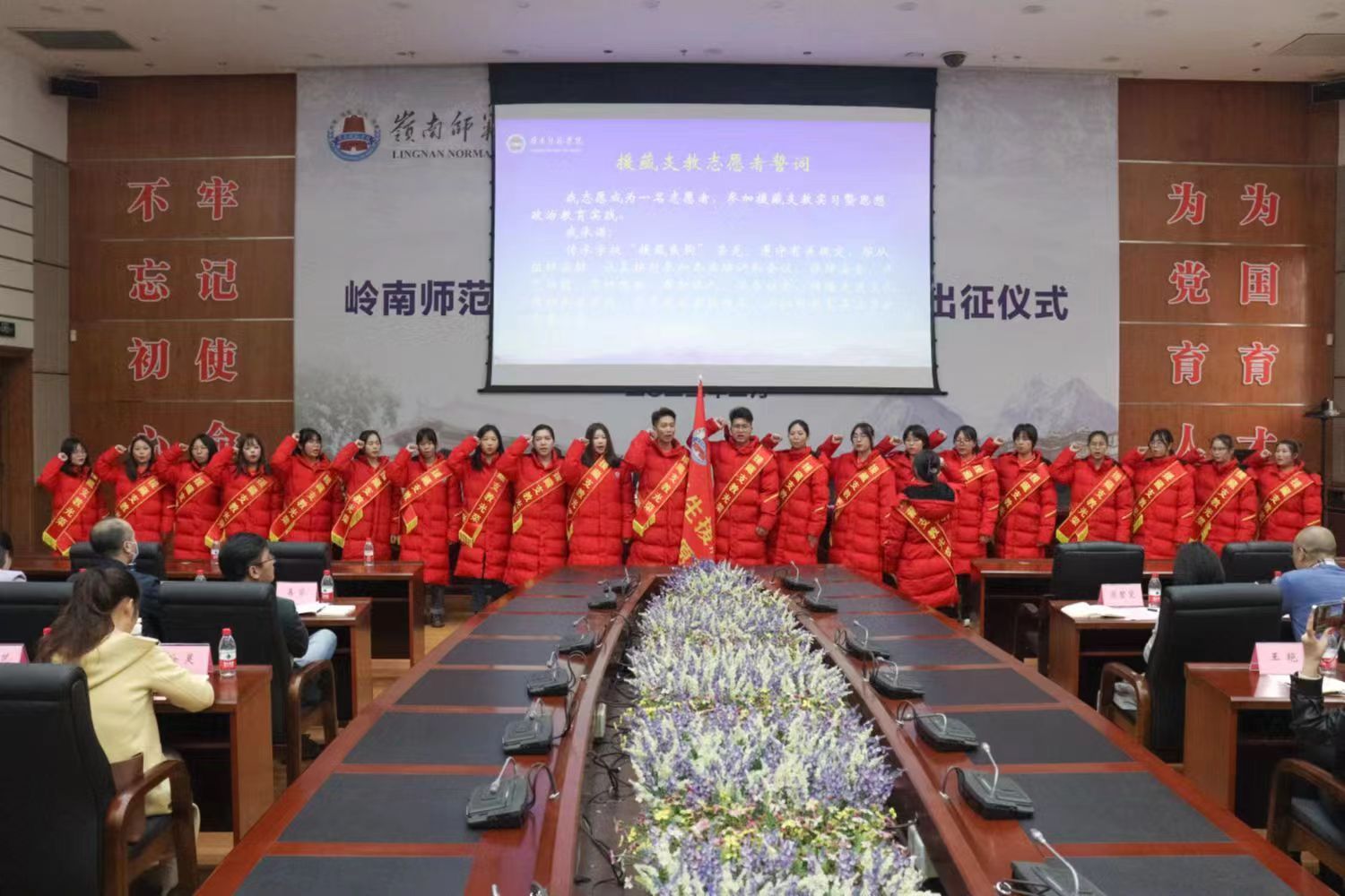 “以青春之名,赴西部之约!”西藏支教队队长廖有婷同学代表全体队员发言,表示将肩负教育使命,播撒“百年师范”的教育火种;维护汉藏情谊,筑牢“粤藏情缘”的连心桥梁;严守队纪队规,擦亮“援藏良驹”的岭师名片。