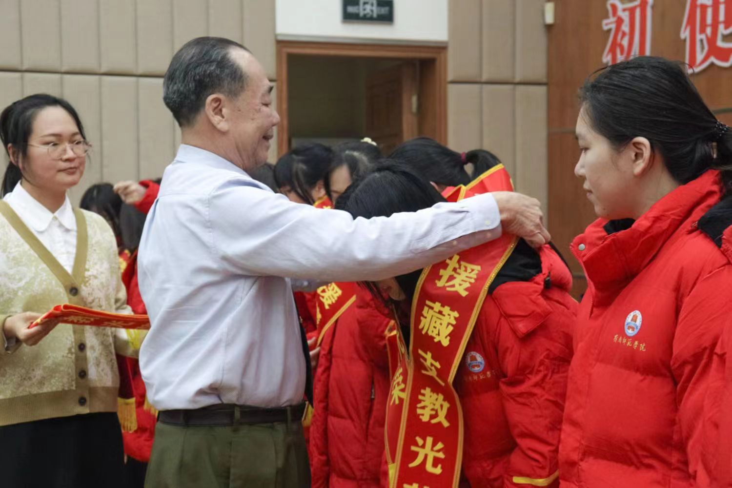 学校1989届校友、曾任西藏自治区林芝市墨脱县县委书记的陈观如为支教队员授荣誉绶带。