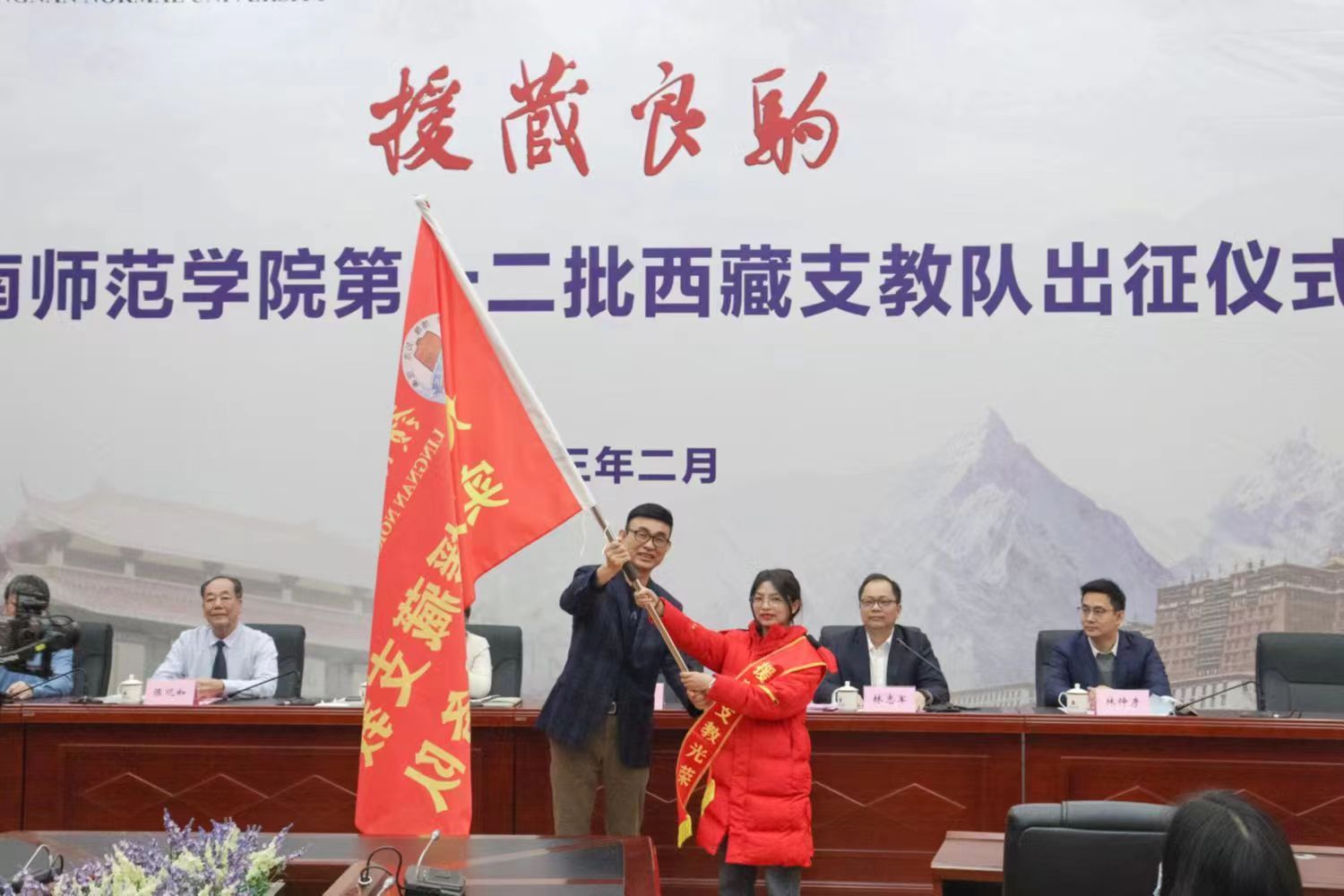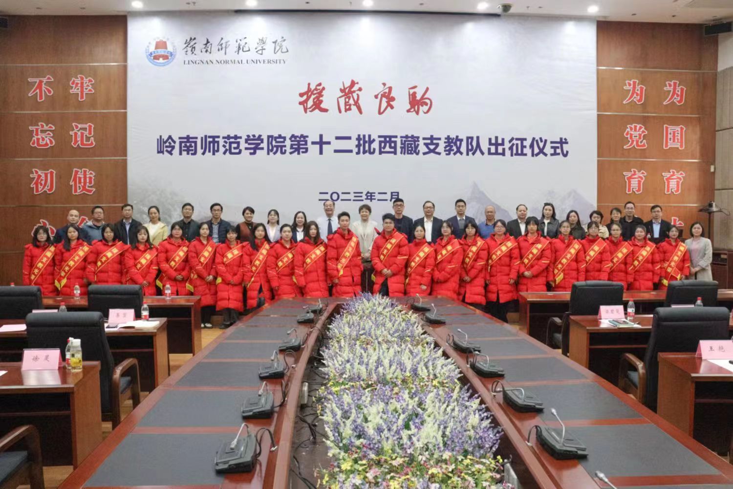 岭师新闻中心讯: 2月28日上午,学校第十二批西藏支教队出征仪式在国际会议厅举行,22名大学生援藏支教队员庄严宣誓,接过传承36年的“援藏良驹”的精神火种,即将踏上雪域高原,前往西藏林芝开展援藏支教实习。党委书记兰艳泽出席会议并讲话,党委副书记黄达海为第十二批西藏支教队授旗。