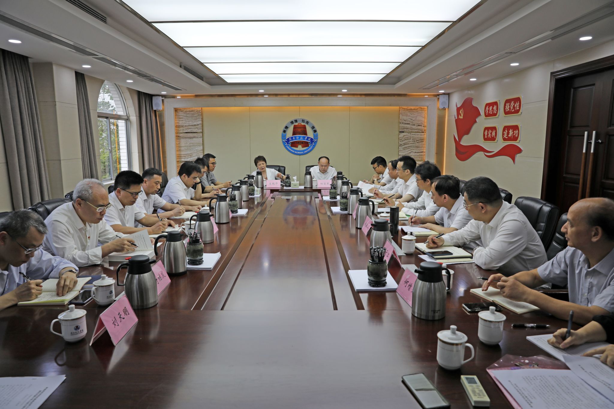 岭师新闻中心讯:学校党委理论学习中心组在一号会议室举行2023年第四次集中学习会,会议主题是“深入学习贯彻党的二十大精神,全面贯彻习近平总书记关于教育的重要论述,贯彻落实习近平总书记视察广东重要讲话重要指示精神,在融入和服务广东新发展格局中推动学校内涵式高质量发展,为广东在推进中国式现代化建设中走在前列作出应有的贡献。” 全体校领导围绕会议主题逐一谈学习体会。学校党委书记兰艳泽主持会议并作总结讲话。学校党委理论学习中心组成员出席会议。省委第二十一巡回指导组成员胡永明、蔡智群列席会议。