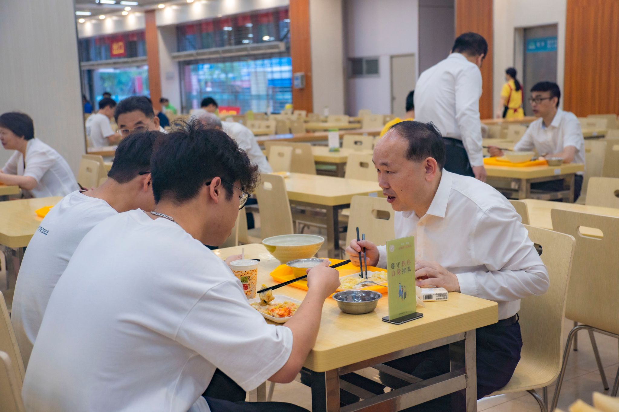 升旗仪式结束后,校领导们来到鸿园餐厅,与同学们同桌用餐,亲切交流,了解大家开学以来的学习生活情况,以及对未来的发展规划。