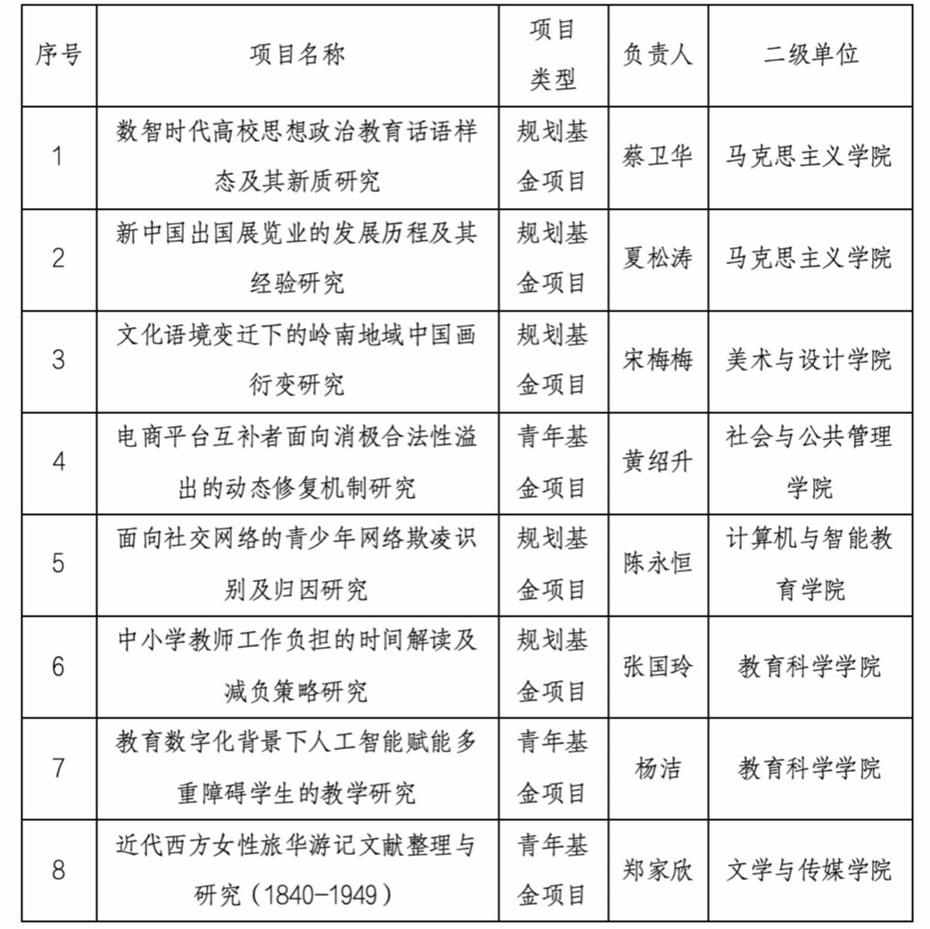 7月31日,教育部社科司公示了2024年度教育部人文社会科学研究一般项目评审结果。我校获得一般项目立项 8 项,其中规划基金项目 5 项,青年基金项目 3 项。立项总数在 743 个立项单位中位列 139 位,规划基金项目立项数位列广东省第 5 位。