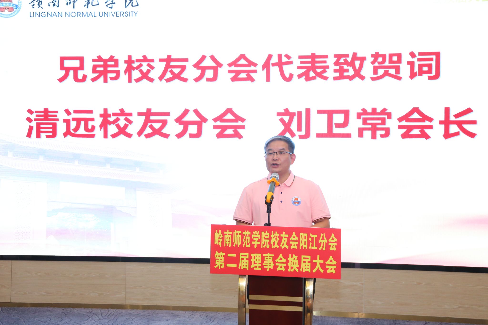 北京,广西,广州、深圳、中山、东莞、佛山、清远、江门、惠州、湛江、茂名、肇庆、韶关等省内外地区校友分会以及美术院、法学院等学院和行业分会代表到场祝贺。清远校友分会会长刘卫常作为分会代表发言,向阳江校友分会顺利换届表示祝贺,他期待未来两地校友能够加强交流合作,共同为学校发展助力。