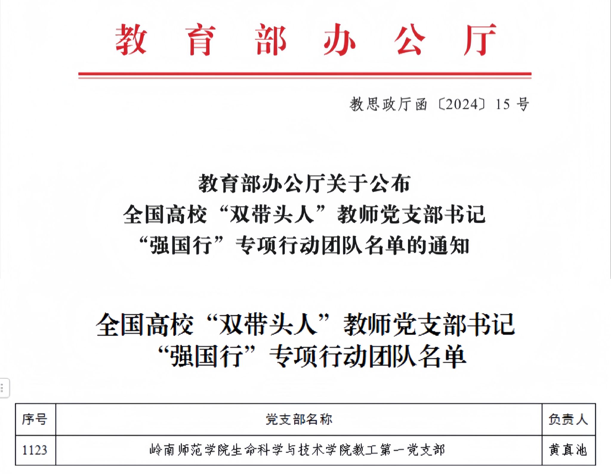 岭师新闻中心讯:近日,教育部办公厅、广东省委教育工委公布全国高校“双带头人”教师党支部书记“强国行”专项行动团队名单和全省高校“双带头人”教师党支部书记“广东行”专项行动建设名单。我校生命科学与技术学院教工第一党支部被确定为全国高校“双带头人”教师党支部书记“强国行”专项行动团队,化学化工学院教工第一党支部、物理科学与技术学院纳米涂层团队党支部被确定为全省高校“双带头人”教师党支部书记“广东行”专项行动建设单位。