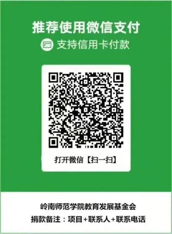 通过扫描下方二维码进入捐款,备注“微爱岭师+班级+姓名”后支付即可;