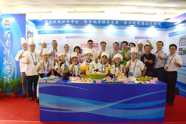 展览会上,我校烹饪与营养教育专业师生们展示的菜品紧扣海鲜主题,“龙腾湛江”、“银滩起舞”、“大鹏展翅”、“湛江生蚝荟萃”等一系列独具匠心的佳肴色香味俱全,受到观众“点赞”。“龙腾湛江”形似一条船,寓意着湛江丰富优质的海产品走向全国乃至全世界,“银滩起舞”描述了章鱼在沙滩起舞,寓意湛江经济能渔拓海洋,大振雄风。