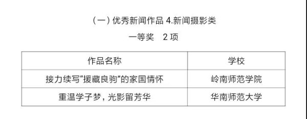 在广东省教育厅公布的广东高校宣传思想优秀作品评选活动结果中,邓倩文老师作品获优秀新闻作品(新闻摄影类)一等奖。4月初,教育部揭晓第三届“全国大学生网络文化节”和“全国高校网络教育优秀作品推选展示活动”结果,由我校易班发展中心组织推报的作品获网文类一等奖1项、摄影类三等奖1项、网络教育优秀作品三等奖1项,创造我校参加全国大学生网络文化节最好成绩。近期,在“2018年广东大学生年度人物”评选中,我校黄惠欣、冼业娟两位同学荣获提名奖。4月25日,广东省教育厅下达2019年教育发展专项资金至我校,宣告我校教育援藏项目在成为教育部高校思想政治工作项目之后,又成为省教育厅立项资助的10个高校思想政治工作精品项目之一。