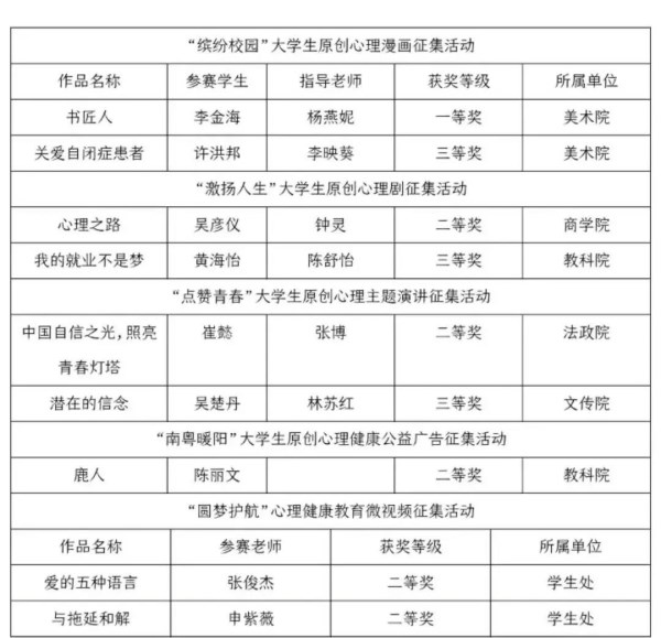 党委学生工作部对标新任务、新要求,发出开展学工队伍“大学习、大讨论”活动的通知,率先组织学工干部深入学习贯彻岭南师范学院第一次党代会、2019年度会议和2019年度学生工作会议精神,精心谋划推进实施“对标行动”计划和品牌创建工作方案,以新举措推动“新学工”上新水平,取得了良好的开局。开学之初,在广东省教育厅公布的高校心理健康教育系列活动中,我校共有9项成果获奖,其中一等奖1项、二等奖5项、三等奖3项,获奖数量在全省高校排名第三。