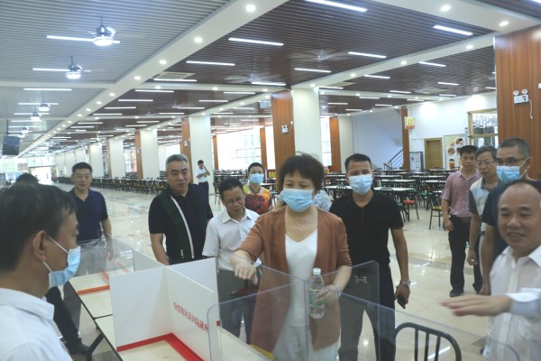 “隔档挡板一定要坐下时高过头顶,大餐桌可以做成‘十’字型挡板,小餐桌一隔为二就行。”在鸿园餐厅,兰艳泽看着已经制作好的隔档模型,边挑选边指导身边的工作人员选用隔档做好疫情防控的原则与标准。兰艳泽一行走到正在装修改造的三楼,叮嘱施工人员在保证进度和质量的前提下一定要注意用水用电安全,并询问工期是否会影响开学学生正常使用。在泽园、鸿园等餐厅,兰艳泽一行重点检查了餐厅的开学前物资准备情况,以及生产安全、食品安全和消防安全的情况,她强调,餐厅作为师生就餐的重点场所,既要抓好疫情防控,更要抓好食品安全、消防安全等。