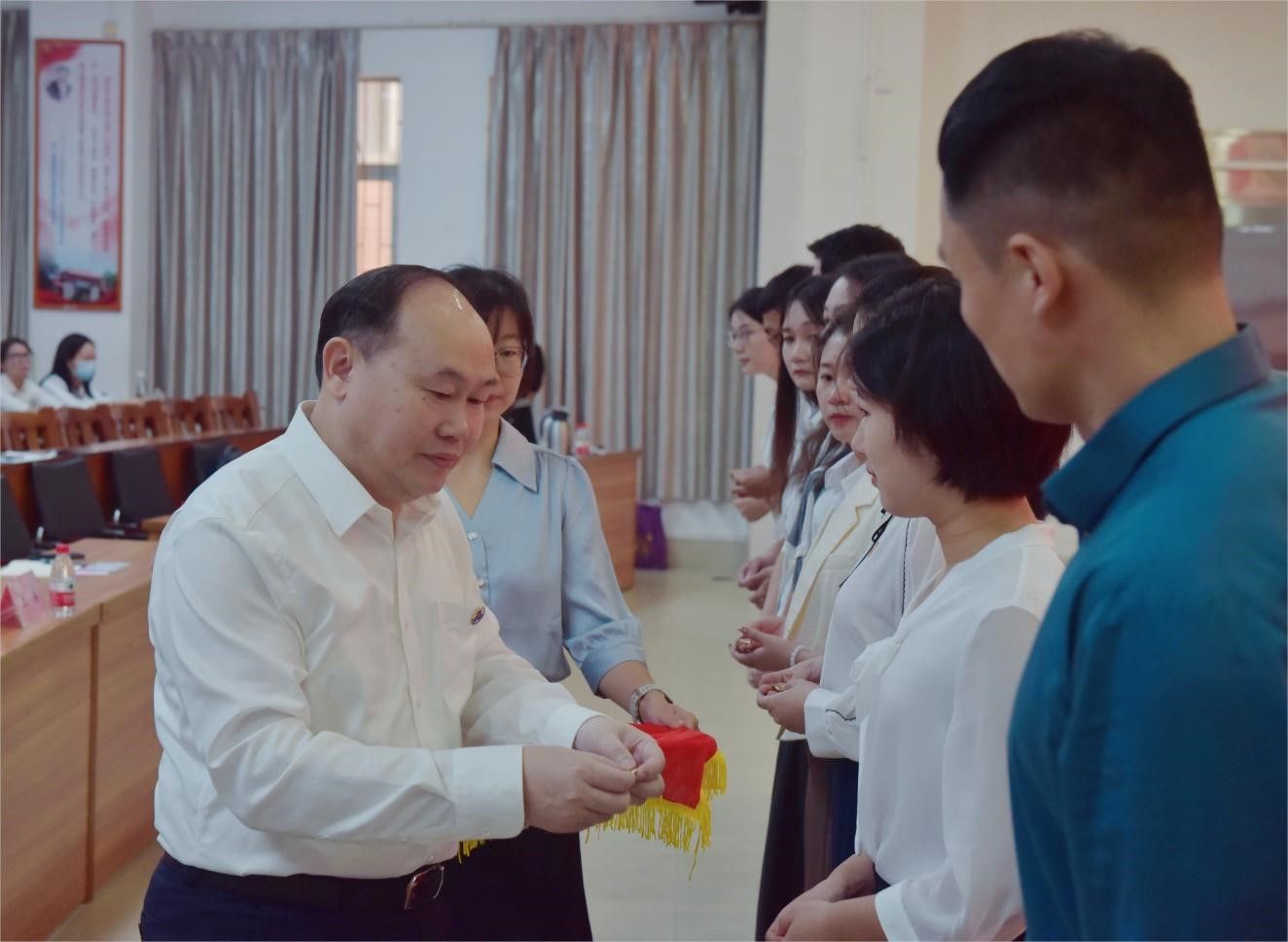 校长阳爱民为新进教工代表颁发校徽