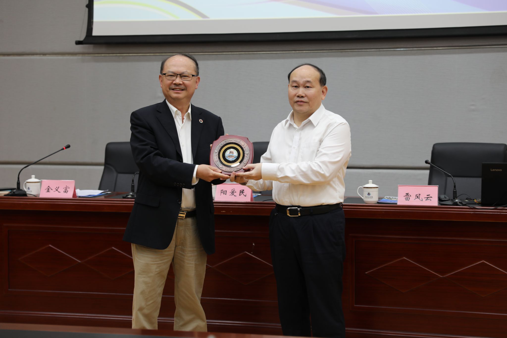 校长阳爱民向嘉宾赠送纪念品