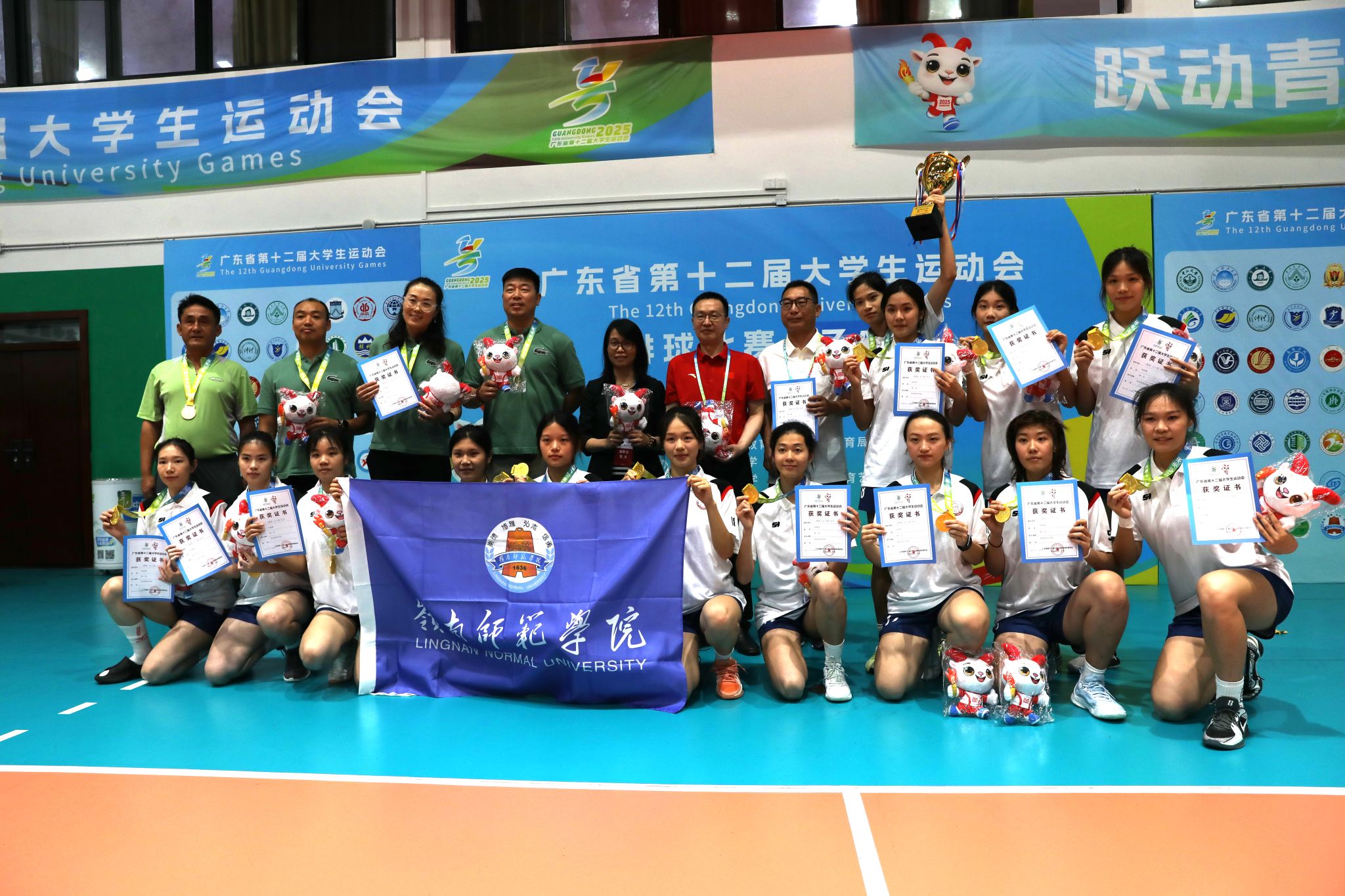 我校女排代表队获冠后在颁奖仪式上合影