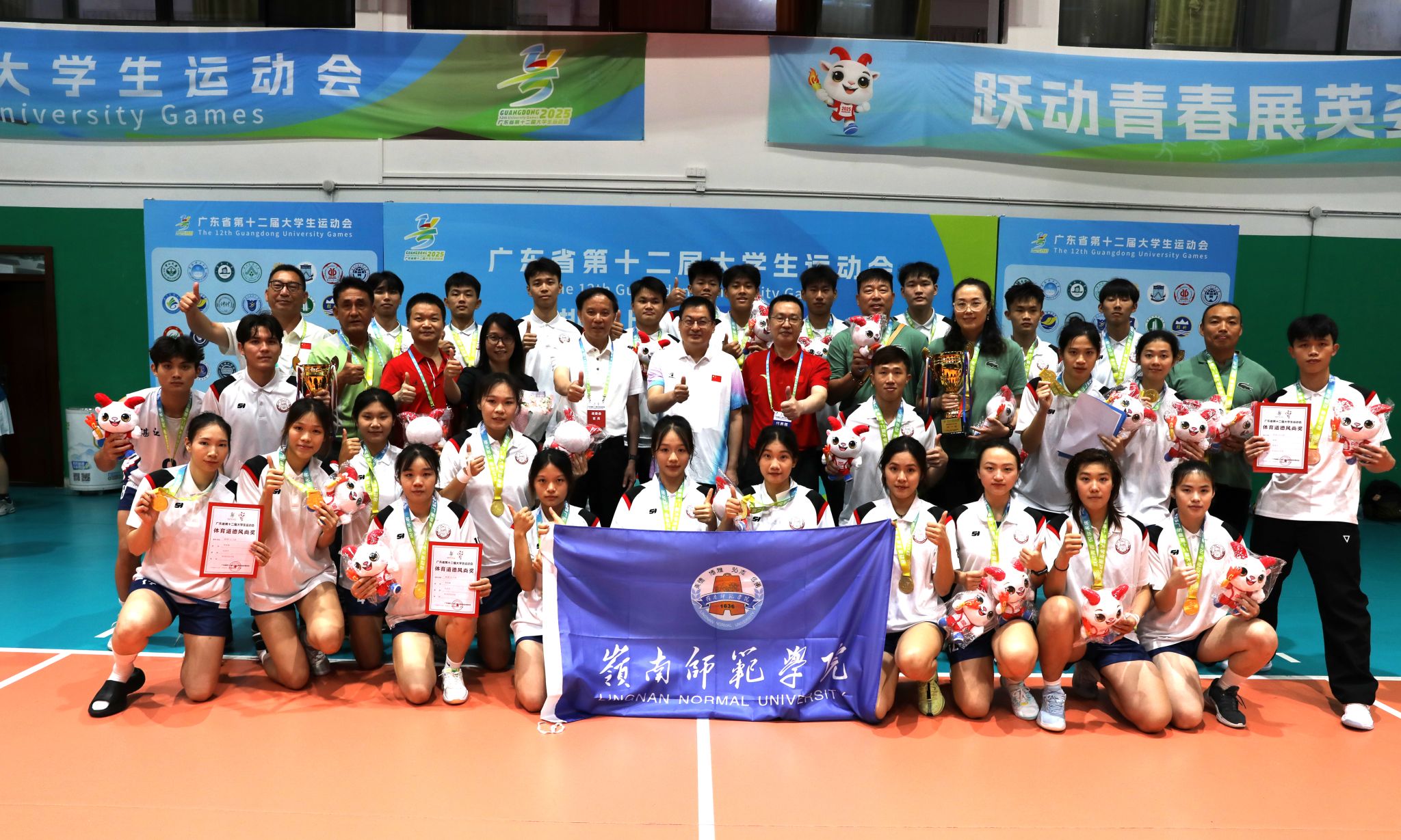 广东省教育厅副厅长程大欣等领导在我校女排夺冠颁奖仪式后与岭师男女排代表队合影